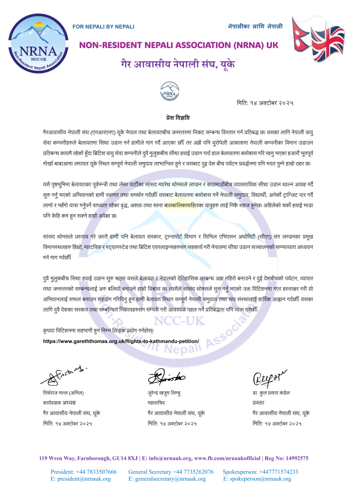 एनआरएनए यूकेले मंगलबार विज्ञप्ति जारी गर्दै बेलायती सांसद ग्यारेथ थोमसले सुरु गरेको डाइरेक्ट फ्लाइट टु काठमाण्डू अभियानलाई समर्थन जाउने क्रममा उक्त आग्रह गरेको हो । संघका अध्यक्ष प्रेम गाहा मगरले भन्नुभयो, ‘सांसद थोमसको यो पहलले यूकेमा बसोबास गर्ने हजारौं नेपाली, विशेषगरी वृद्ध, विद्यार्थी र भूतपूर्व गोर्खा परिवारका लागि यात्रा सहज र सुलभ बनाउनेछ । यसले नेपाल–बेलायतबीच पर्यटन, व्यापार र जनस्तरको सम्बन्धलाई थप नयाँ उचाइमा पुर्‍याउनेछ ।’