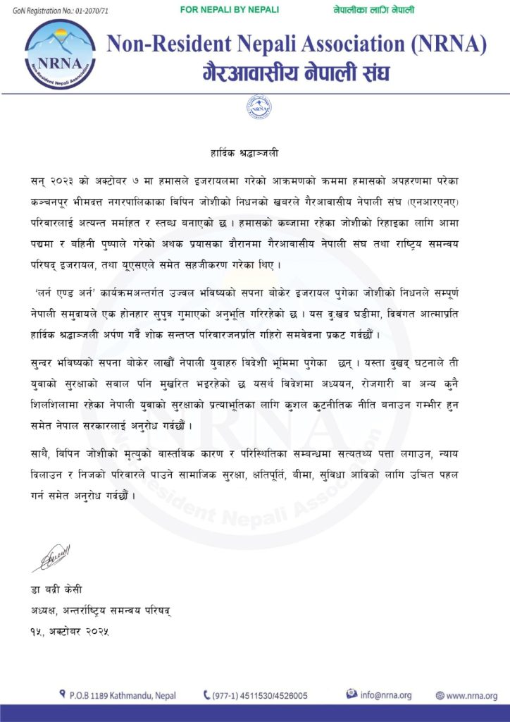 १५ अक्टुबर २०२५ बुधबार अध्यक्ष बद्री केसीले हमासको नियन्त्रणमा परी ज्यान गुमाएका विपिन जोशीप्रति श्रद्धाञ्जली सन्देश जारी गर्नुहुँदै विदेशमा रहेका नेपालीको सुरक्षाका निम्ति कुशल कूटनीतिक नीति बनाउने विषयमा गम्भीर हुन समेत अनुरोध गर्नुभएको छ ।