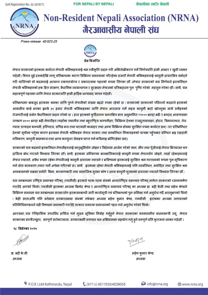 अध्यक्षद्वय महेशकुमार श्रेष्ठ र डा.बद्री केसीले आइतबार २८ डिसेम्बर २०२५ मा विज्ञप्ति जारी गर्नुहुँदै इराकमा कार्यरत नेपाली श्रमिकहरूलाई श्रम स्वीकृति प्रदान गरी अभिलेखीकरण गर्ने सरकारको निर्णयप्रति आभार र खुसी व्यक्त गर्नुभएको हो ।