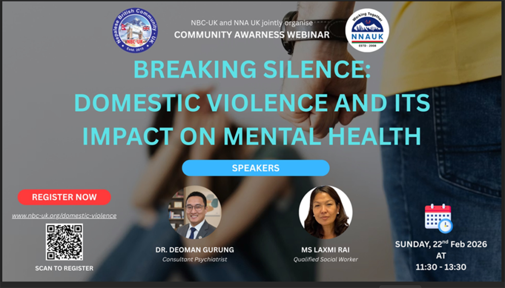लन्डन । नेप्लिज ब्रिटिश कम्युनिटी यूके (एनबीसी यूके)ले नेप्लिज नर्सिङ एसोसिएसन यूके (एनएनए यूके) सँगको सहकार्यमा ‘मौनता तोडौं: घरेलु हिंसा र मानसिक स्वास्थ्यमा यसको प्रभाव’ शीर्षकमा एक सामुदायिक सचेतनासम्बन्धी वेबिनार आयोजना गर्ने भएको छ । उक्त वेबिनार आइतबार, २२ फेब्रुअरी, बिहान ११:३० देखि दिउँसो १:३० बजेसम्म हुनेछ।