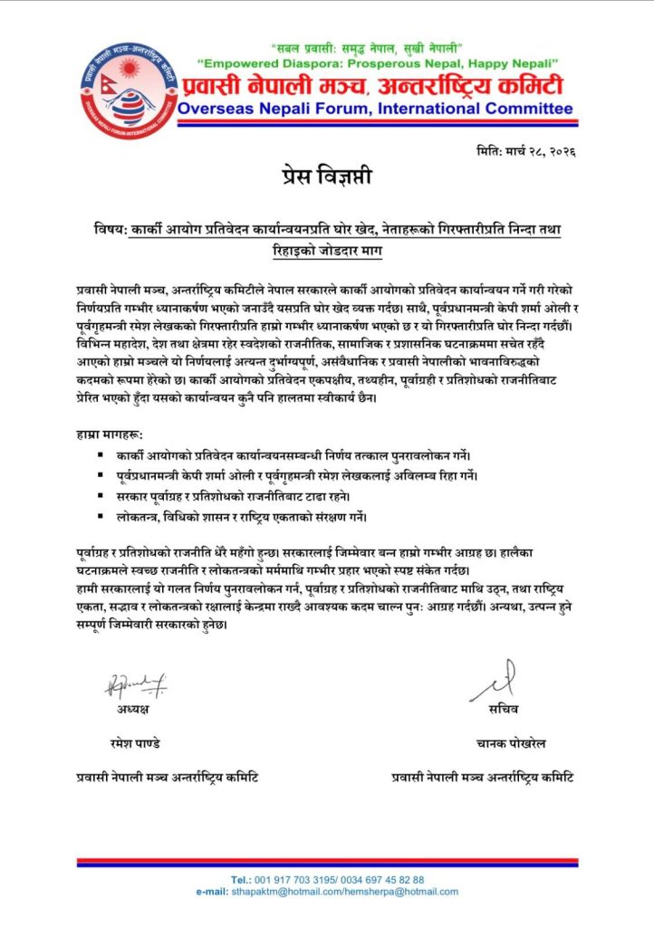 ओली र लेखकलाई रिहा गर्न प्रवासी नेपाली मञ्च अन्तर्राष्ट्रिय समितिको माग