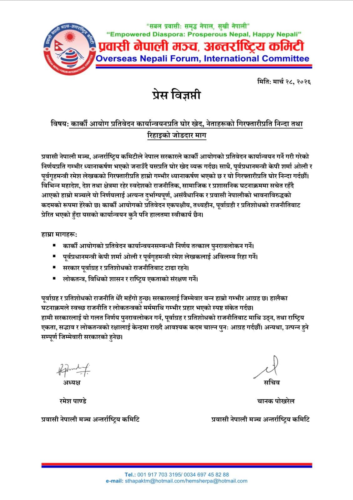 मञ्चका अध्यक्ष रमेश पाण्डे र सचिव चानक पोखरेलद्वारा शनिबार जारी प्रेस विज्ञप्तिमार्फत पूर्वप्रधानमन्त्री केपी शर्मा ओली र पूर्वगृहमन्त्री रमेश लेखकको पक्राउप्रति निन्दा गर्दै तत्काल रिहाइको माग गरेको छ । साथै, राजनीतिक प्रतिशोधबाट प्रेरित निर्णय नगर्न र लोकतान्त्रिक मूल्य–मान्यता तथा विधिको शासनको संरक्षण गर्न सरकारलाई आग्रह गरेको छ।