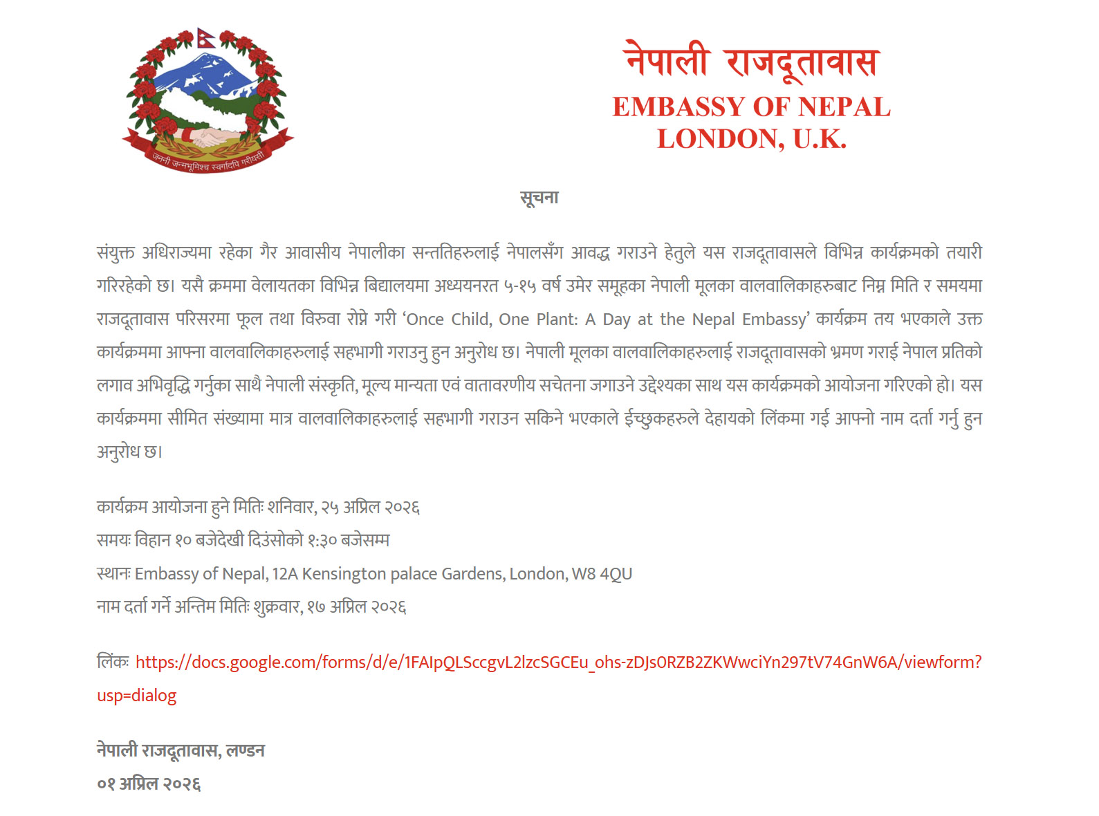 दूतावासले जारी गरेको सूचनाअनुसार बेलायतका विभिन्न विद्यालयमा अध्ययनरत ५ देखि १५ वर्ष उमेर समूहका नेपाली मूलका बालबालिकालाई लक्षित गरी कार्यक्रम सञ्चालन गर्न लागिएको हो। कार्यक्रमअन्तर्गत सहभागी बालबालिकाले दूतावास परिसरमा फूल तथा बिरुवा रोप्नेछन् ।