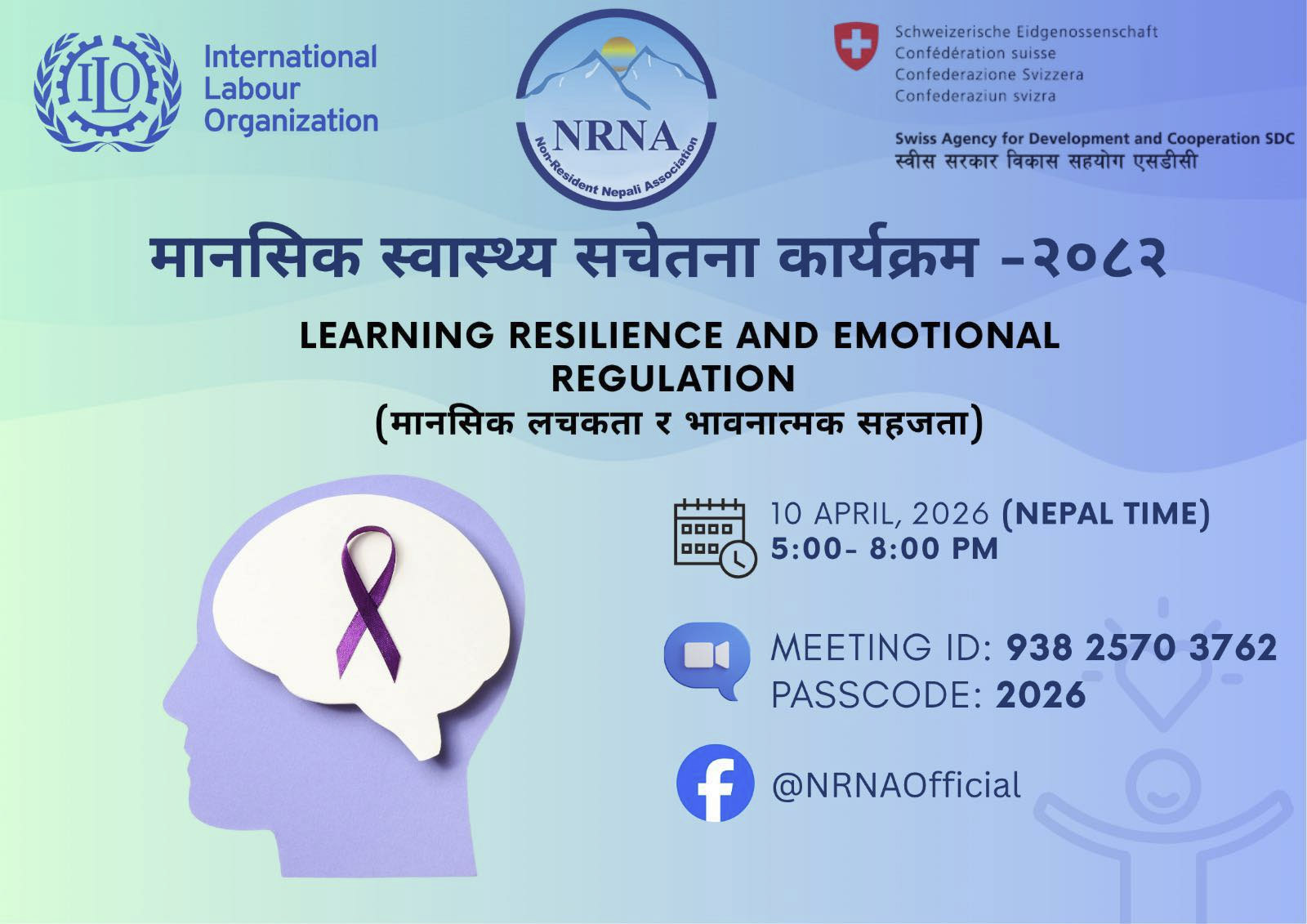 काठमाडौँ । गैरआवासीय नेपाली संघ (एनआरएनए) ले प्रवासी नेपाली श्रमिकका लागि १० अप्रिलमा मानसिक स्वास्थ्य सचेतना तथा परामर्श कार्यक्रम आयोजना गर्दैछ ।