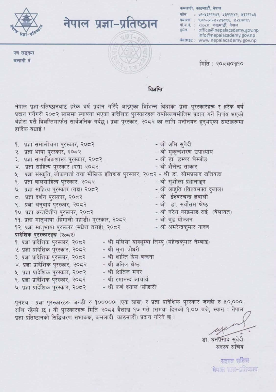प्रज्ञा अन्तर्देशीय पुरस्कार २०८१ भवीलाल लामिछाने (भारत)लाई दिइएको थियो ।